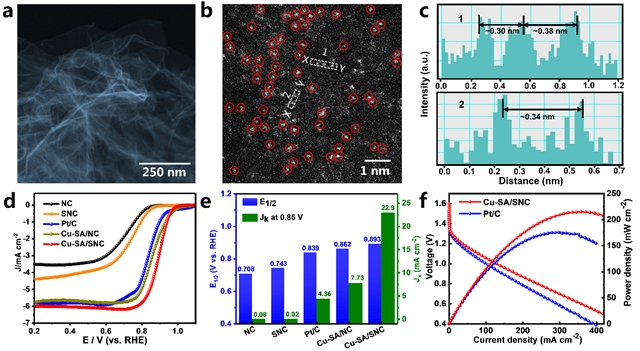 图1 碳载体上的Cu单原子形貌表征和电催化性能
