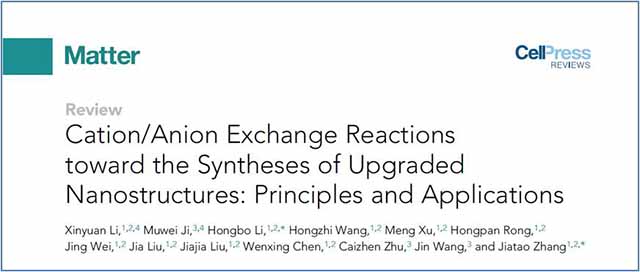 近日,开云kaiyun官网化学与化工学院院长张加涛团队在Cell旗下材料学旗舰期刊《Matter》上发表了题为《Cation/Anion Exchange Reactions towards the Syntheses of Upgraded Nanostructures: Principles and Applications》的综述文章(Matter 2020, 2, 554-586),基于团队在离子交换策略精准合成II-VI族掺杂及异质纳米晶及应用方面研究成果,详细介绍了合成无机纳米晶的离子交换反应的反应机理、材料合成进展、性能应用和展望。