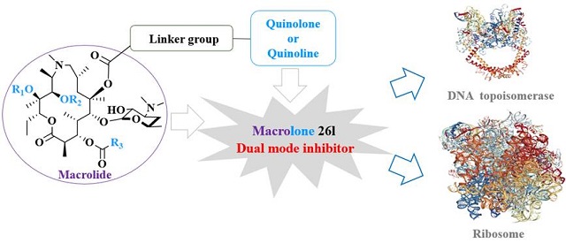 耐药菌感染已成为全球人类健康的主要威胁之一。但抗生素面临着一上市就迅速产生耐药性的研发困境。大环内酯类抗生素在细菌核糖体狭窄的新生肽通道亲和从而阻碍蛋白质输出。喹喏酮作用于拓扑异构酶,形成酶-DNA-喹喏酮三体复合物,干扰DNA复制过程。基于杂合抗生素的理念——将两个作用机理不同的分子共价连接,获得具有双重作用模式的杂合物,以克服其中一种或两种药物的耐药机制,重获抗菌活性,并且大幅降低微生物耐药性的产生几率。本研究的难点是核糖体和拓扑异构酶为两个迥异的靶标,对配体的结构要求差异较大,杂合物很难实现同时作用这两个靶标。梁建华课题组以阿奇霉素为先导,将喹诺酮类化合物以酰化的方式结合于阿奇霉素C-6位上,经过筛选,发现阿奇霉素与环丙沙星/加替沙星的杂合物体可以通过类似于氟喹诺酮的方式——使促旋酶中毒来抑制细菌DNA 的复制,从而提高化合物对高水平耐药菌的抗菌活性。研究采用了DNA超螺旋抑制实验、DNA裂解实验以及分子对接和全细胞水平生长抑制等实验验证,结果具有一致性。这种既可抑制蛋白合成又可抑制DNA复制的双重作用模式为未来合理设计抗耐药菌的新型抗生素奠定了基础。