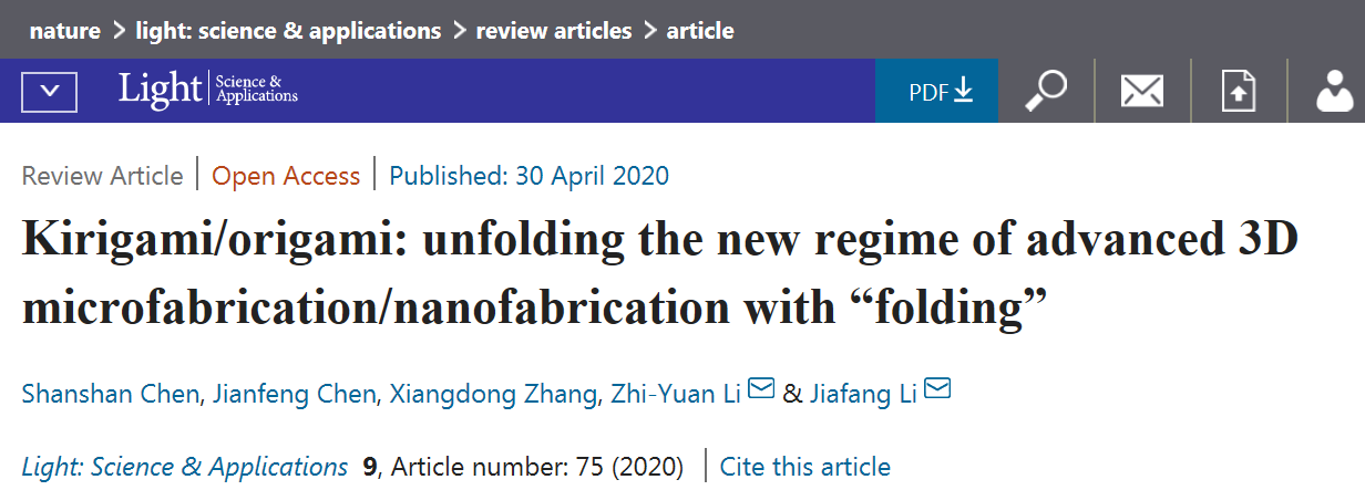 文章信息:Shanshan Chen#, Jianfeng Chen#, Xiangdong Zhang, Zhi-Yuan Li* and Jiafang Li*, “Kirigami/origami: unfolding the new regime of advanced 3D microfabrication/nanofabrication with “folding””, Light: Science & Applications 9, 75 (2020).(#为共同一作;*为通讯作者) 文章链接:https://www.nature.com/articles/s41377-020-0309-9