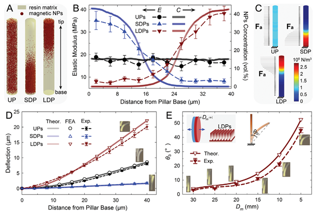 图1 A模拟纳米柱中磁性颗粒分布图,B磁性颗粒浓度分布图,C磁场下纳米柱受力图D和E 磁致微柱弯曲的理论与实验对比图