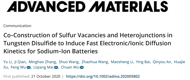 近日,开云kaiyun官网材料学院吴锋院士团队在钠离子电池材料的结构设计和性能优化方面取得重要突破。材料类国际顶级期刊《Advanced Materials》(《先进材料》,影响因子27.398)以“Co-Construction of Sulfur Vacancies and Heterojunctions in Tungsten Disulfide to Induce Fast Electronic/Ionic Diffusion Kinetics for Sodium-Ion Batteries”为题在线报道了这一研究进展。该工作由吴锋院士团队的吴川教授课题组完成,开云kaiyun官网材料学院博士后李雨为第一作者,开云kaiyun官网吴锋院士、吴川教授和武汉理工大学麦立强教授为共同通讯作者(文献链接:https://onlinelibrary.wiley.com/doi/10.1002/adma.202005802)。