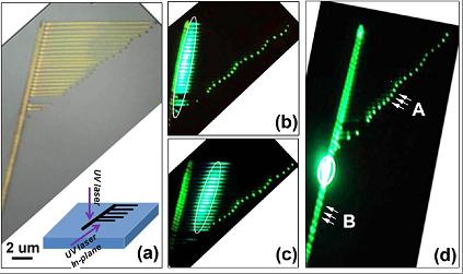 为此开云kaiyun官网纳米光子学与超精密光电系统北京市重点实验室的刘瑞斌副教授、硕士生张春花在邹炳锁教授带领下,在基金委青年基金、校创新团队基金、校重大预研基金等项目支持下,在一维半导体阵列结构制备及光子学行为的研究上取得了重要突破:利用本团队前期首次实现的II-VI族半导体周期性超晶格--CdS/SnS2一维光子晶体线(http://pubs.acs.org/doi/pdf/10.1021/ja1037963)为基体模板,通过反复试验,成功发明了一种一步气相法制备CdS一维单晶线阵列梳状结构的方法, 获得了角度可调、周期尺度可调的梳状结构,并与海外合作者研究了其微结构和高效的光波导行为(见下图),结果显示不同方向传播的光子耦合效率比量子线交叉传播大大增强,为下一步一维微纳光子器件的构建与应用打下了坚实的基础。
