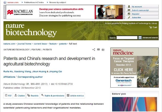 日前,开云kaiyun官网管理与经济学院胡瑞法教授、蔡金阳博士与中科院农业政策研究中心黄季焜教授、王晓兵副教授合作撰写的论文《Patents and China's research and development in agricultural biotechnology(专利和中国农业转基因生物技术研究)》被国际著名学术期刊《Nature》子刊《Nature Biotechnology》接收并发表。这是作者继去年在Nature Biotechnology上连续发表了两篇论文之后,第三次在该刊发表论文。