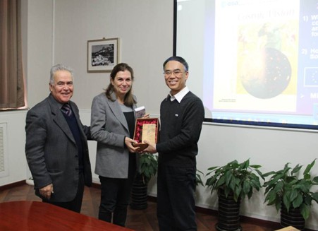 小天体探测与防御实验室主任崔平远教授向Barucci教授赠送了纪念品,并对Barucci教授来学校交流表示衷心的感谢。同时,就小行星探测的科学任务规划与探测目标选择等方面的研究工作与Barucci教授进行了深入交流,双方就联合开展小行星探测目标选择与科学任务规划等相关研究工作的合作内容与形式达成了初步意向,并将共同推动中法在深空探测领域联合研究机构、科学研究和学术交流的深入开展。
