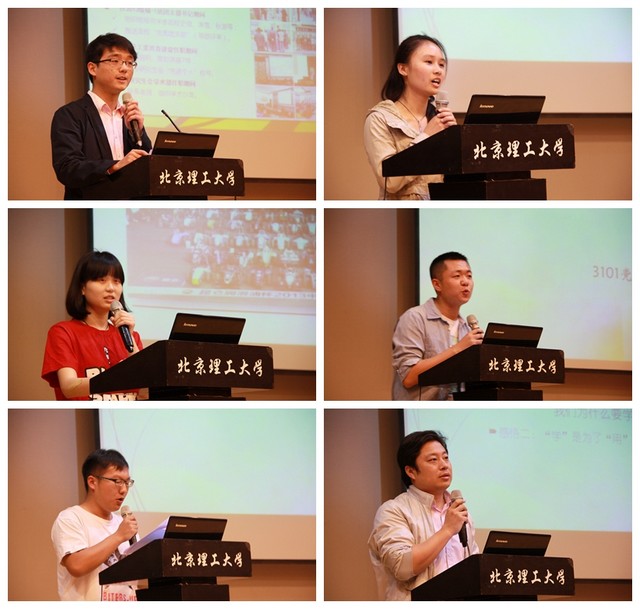2013届“机械星工坊”活动“才艺之星”许明锐、崔雨涵一曲合唱揭开了活动的序幕,随后“身边的榜样”为现场观众做了自己的成长和感悟分享。永远精力充沛的工业工程研究生鲍衍地,分享了他带领学院2013级约300名硕士生活跃在学术论坛、运动会、文艺汇演、社会实践等多个舞台的故事,以及他挤出一分一秒的时间协调学习、科研和社会工作的经验。三叶草志愿服务协会吴慧琪在分享中讲到,天空不曾留下飞鸟痕迹,但它曾翱翻腾翔,世间未曾留下你我姓名,但只要无私奉献,那便是快乐的,他们以青年人的视角记录下自己的感受,他们在帮助和服务他人中学会付出和感恩。2013年“感动北理”团队——大学生方程式车队的陈南瑾说,他们都是大学校园中普普通通的学生,却在一起共同奋斗,创造了一个又一个让人惊叹的奇迹,从顶峰到低谷,他们从不放弃,相信驰骋在赛道上的,永远是青年人的梦想。国防生代表周凯讲述了作为一名学生党员如何实践“党群一帮一”、如何组织“红色1+1”、如何创办宣教阵地,用一则则小故事分享了一群青春活力、勇于担当的大学生党员的事迹。2011级车辆专业本科生周登岳,用参加数学建模竞赛、机械创新大赛和方程式汽车大赛的经历诠释了本科生如何培养科研能力、如何认识学科竞赛,他说,学是为了用,时刻要求自己绝不把知识放到肚子里。