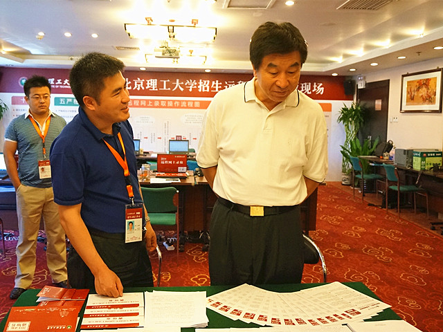 郭大成书记还审阅了招生录取工作人员上岗考试试卷、《录取进行时》工作简报、新生入学须知以及“新鲜出炉”的2014年新生录取通知书。
