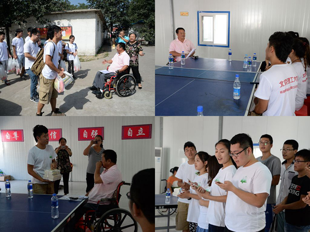 8月6日上午,实践团携手十余名贫困新生来到唐山康复村看望村民们。唐山康复村1991年落成,1992年开始入住。康复村的居民都是1976年唐山大地震中致残的截瘫患者,现有居民25户共51人。这里是全世界唯一一处专为地震后致残的截瘫人员建造的无障碍住宅小区。走进康复村,同学们发现:康复村处处可见极富人性而颇为“神奇”的设计:宽达1米的房门、“隐藏”在墙内的卫生间、相对低矮的家具设施,这些无障碍设施的独特设计令人惊叹,更令人感动。