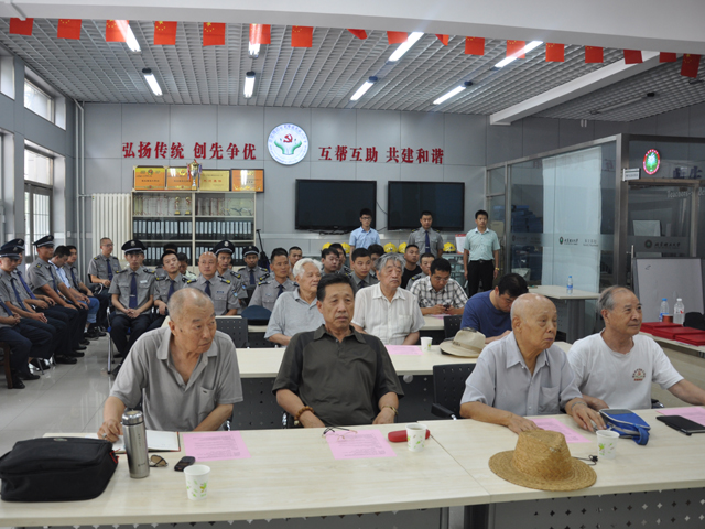 赵宏宇同志向汇报会致辞。他首先向各位思想疏导师长期以来对校园安保工作的大力支持,共同营造一个和谐稳定的校园环境表示衷心的感谢!党建工作室成立已经有4年之久,一直秉承弘扬传统、创先争优、互帮互助、共建和谐的工作宗旨。各位老同志们作为思想疏导师,牺牲自己宝贵的时间,利用多年来的丰富阅历和政治优势,始终不渝的将这些优良传统传授给我们年轻的保卫干部和保安员同志们,使我们汲取了很多的正能量,老同志们也帮助我们分担、解决了很多难点难题,为校园安保工作把握好很多的大方向,今天借此机会再一次向老同志们表示感谢。