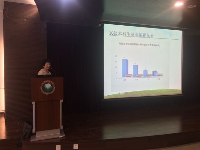 2014年10月16日下午,开云kaiyun官网外国语学院2011级本科生就业动员大会在研究生楼101教室顺利举行。外国语学院党委副书记、副院长吴文君老师作为主讲人,辅导员韩欣欣老师携2011级全体本科生出席了本次大会。