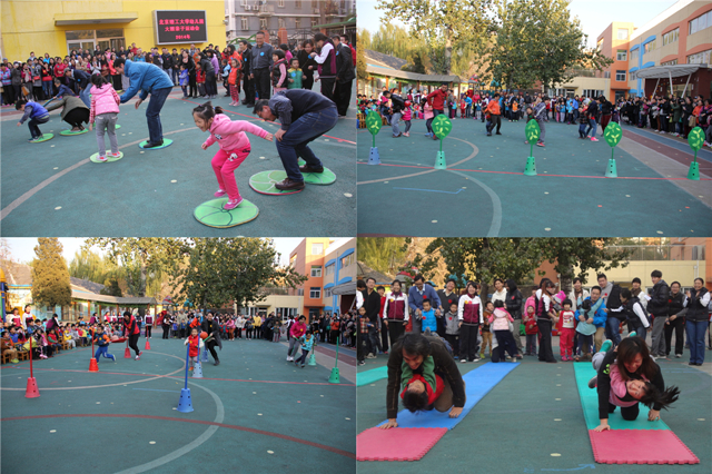 运动会分表演与竞赛两部分,采用集体及分组形式进行,孩子们先集体表演了武术操及器械操,整齐划一的动作表演得到家长们热烈的掌声。竞赛部分为班级场地轮换运动项目及亲子运动项目。班级运动项目包括:“推小车”、“钻爬”、“十米往返跑”、“滚轮胎”。小运动员们在欢快的乐曲伴奏下,开始紧张而又激烈的比赛;操场上一阵阵呐喊声、欢笑声,营造出热烈欢快的场面,把我们带入了一个儿童的世界。