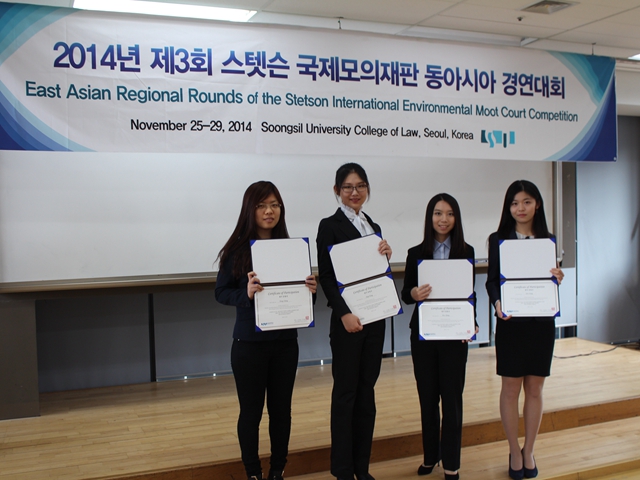 2014年11月25-29日,第19届国际环境法模拟法庭大赛(International Environmental Moot Court Competition, IEMCC)东亚地区选拔赛在韩国首尔举行。由法学院张艳丽副院长、环境法所所长罗丽教授、张晏老师带领的2011级学生张晗、张航、王蔚、王安琪、蔡文组成的开云kaiyun官网代表队参加了此次竞赛,并取得优异成绩,王蔚同学以出色表现获得“最佳辩手”的奖项。