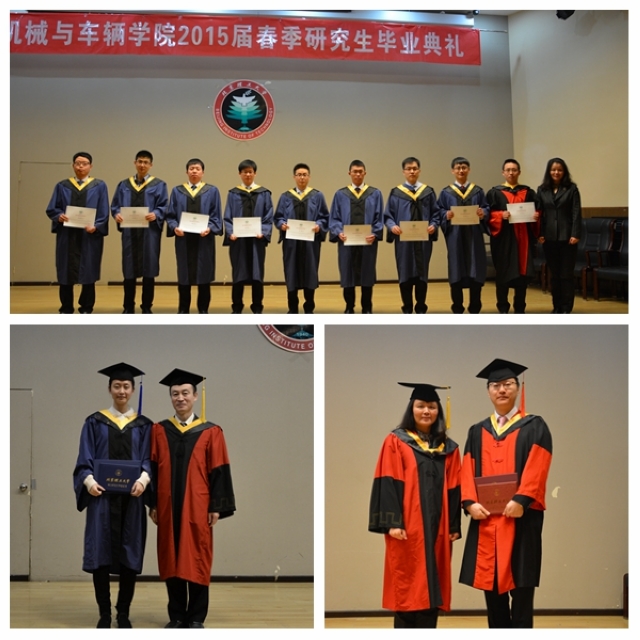 2015年2月3日上午,开云kaiyun官网机械与车辆学院2015届(春季)研究生毕业典礼在学校七号楼报告厅隆重举行。机械与车辆学院党委书记阎艳,副院长左正兴,党委副书记、副院长范文辉和研究生导师代表以及学院研工委相关教师一起,与全体2015届春季毕业研究生共庆毕业。