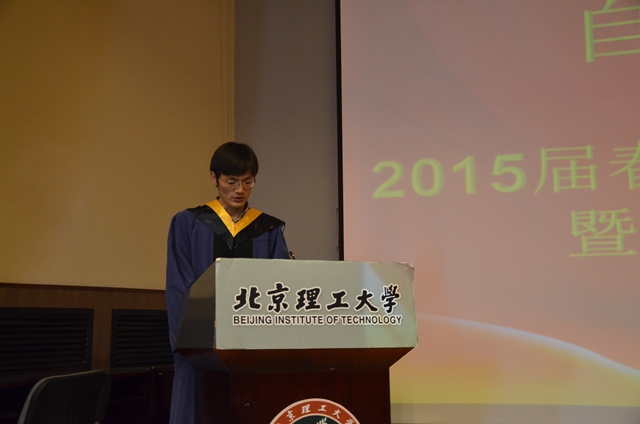 自动化学院院长兼党委书记王军政教授代表学院在典礼上致词:首先,向圆满完成学业的8名博士和113名硕士顺利毕业表示热烈祝贺。其次,回顾了近年来自动化学院在师生共同勤勉努力下取得的成绩,对毕业研究生们为学科发展做出的成绩表示感谢。接着,向毕业研究生提出了几点期望:(1)做一个理想远大,境界高远的人;(2)做一个包容宽厚、善于合作的人;(3)做一个脚踏实地、知行合一的人;(4)做一个不断学习,勇于创新的人。最后,王院长代表自动化学院祝同学们远举高飞,博学笃行,事业有成,大展宏图,拥有精彩人生。
