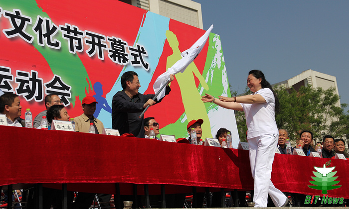 入场式结束后,校党委书记张炜将“体育文化节”旗帜授给教师代表北京市教学名师李林英,开始了传承接力活动。北京市教学名师李林英、长江学者奖励计划特聘教授龙腾、校男子足球队原队长自动化学院辅导员卢斌、校大学生艺术体操队队长雨童、校第二届良乡校园马拉松冠军魏豪等五组师生代表进行了接力传递。 “烽火岁月、饮水思源”,“坚定信念、辗转办学”,“肩负重任、报效祖国”,“凝心聚力、开创辉煌”,“激情进取、梦想希望”,他们用体育文化特有的方式重温校史,向所有北理工人致敬,并号召全校师生员工以饱满的热情、健康的体魄迎接我校第十四次党代会的胜利召开,继续书写北理工更加辉煌的未来!