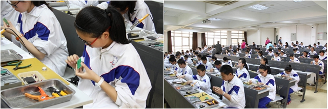 在为时两个半小时的科技实践课程中,光电创新基地张丽君等三位教师严密组织,认真授课、悉心指导,学生严肃认真,遵守纪律,听从指挥。这些学生学习了工具的使用,认识了基本元器件,掌握了电子工艺装配方法,最终全部成功完成了自己的实践作品。
