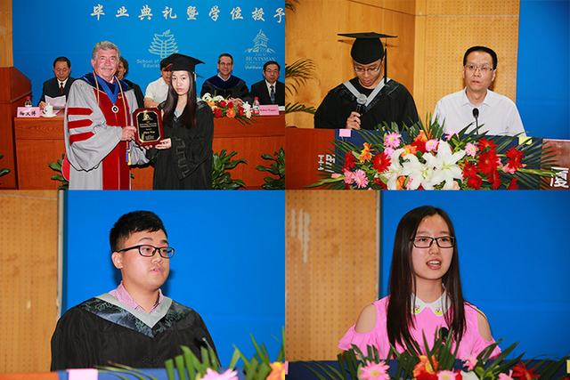 杨树兴副校长发表致辞,他首先向即将迈向人生新旅程的毕业生们表示热烈的祝贺,并向专程来华参加毕业典礼的犹他州立大学嘉宾们表示诚挚的欢迎。他叮嘱同学们要懂得感恩、珍惜时光、勇于承担肩上的责任。同学们离开校园之后,将融入社会的熔炉,面对充满挑战的未来,他鼓励同学们自信、自强、进取。无论同学们在人生路上遇到什么境遇,母校总是在身后默默关注和支持他们。最后,他期待同学们走出校园之后能取得更大的成功,并希望同学们能够继续关心母校的建设和发展,常回家看看。