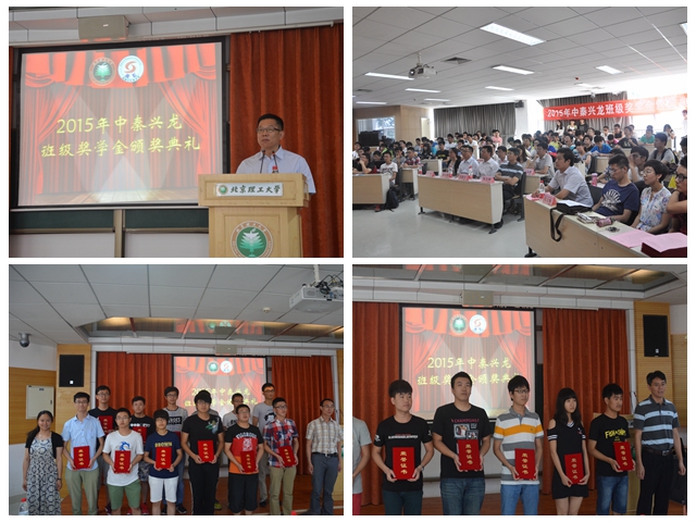 2015年6月19日上午,第二届中秦兴龙班级奖学金颁奖典礼在良乡校区举办,中秦兴龙工业集团副总经理张殿杰、兴龙源金属制品有限公司总经理胡忠臣、兴龙源金属制品有限公司副总经理齐文远等企业来宾以及校长助理郝志强、学生工作处副处长许欣、基础教育学院副院长朱光辉等老师参加了本次活动。仪式由机械与车辆学院党委副书记、副院长范文辉主持。