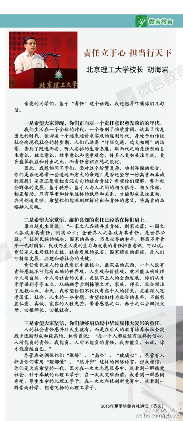 原文链接:【人民网】北理工校长给毕业生的叮嘱:责任立于心 担当行天下