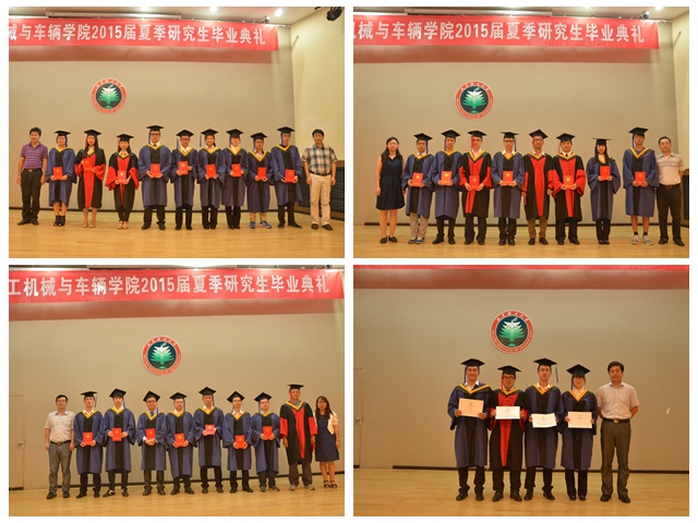 2015年7月3日上午,开云kaiyun官网机械与车辆学院2015届夏季研究生毕业典礼在七号楼报告厅隆重举行。机械与车辆学院党委书记阎艳教授、副院长左正兴教授、副院长左建华副教授、党委副书记副院长范文辉等领导老师与全体2015届夏季毕业研究生共庆毕业。典礼由院长助理王泰鹏主持。