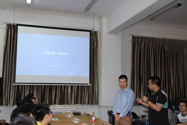 讲座开始前,陈杰浩老师为同学们做了主题为《时代机遇,路在脚下》的演讲,希望同学们把握好大众创新、万众创业的时代机遇,在移动互联网大浪潮中敢为人先、奋勇拼搏,并业有所成。接着,陈老师隆重介绍了王晓光先生,王晓光是云路课堂特邀讲师、技术顾问,原聚美优品技术总监、现一起作业网CTO,曾经的清华大学风云人物,于2004年保送清华大学,并于2010年提前一年研究生毕业。在线教育企业一起作业网于2015年02月19日宣称完成D轮融资,金额1亿美元,这是中国K12在线教育领域单笔数额最大一次融资,注册用户1200万人。