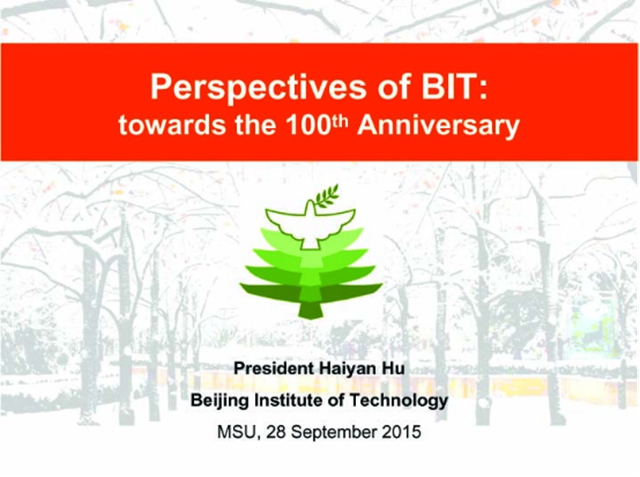 胡校长随后做了题为“北理工建校百年愿景(Perspectives of BIT: towards the 100th Anniversary)”的演讲,从历史回顾之一(1940~1980)、历史回顾之二(1980~2000)、新世纪办学思路(2001~2040)三个历史阶段展现我校发展轨迹和未来愿景,系统阐述了建设亚洲/世界一流理工大学的目标、瞄准国家战略需求的发展定位、学术为基和育人为本的价值取向、开放办学的国际化战略。