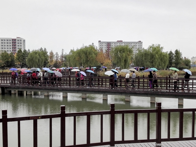 报告会之余,在校长助理郝志强等领导的带领下,老同志们参观游览了良乡校区,实地感受良乡校区翻天覆地的变化以及和谐美好的育人环境。雨中的北湖分外妖娆,老同志们纷纷拿起相机合影留念。游览校区之后,老同志们还参观了良乡校区学生食堂并在食堂就餐,得到了后勤集团党委书记巫后新等领导的热情接待。