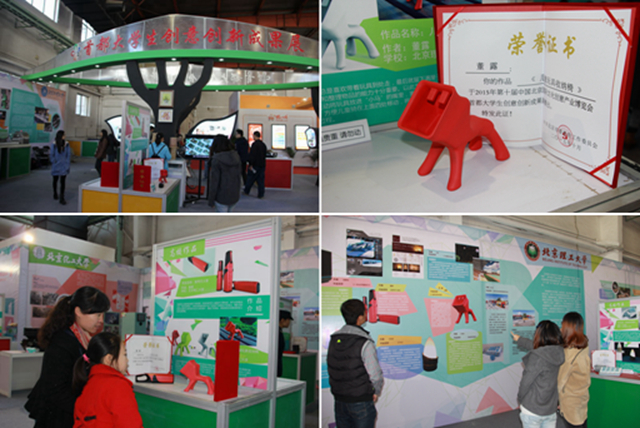 在激烈的角逐中,我校共9名同学获奖,2015级研究生董露同学获得唯一金奖,2012级本科生谭耀东、闫茂铠、钱薇威三位同学获得银奖3个,2012级本科生李汝偲、阎海伟、钟疏影三位同学获得铜奖,钱薇威、李汝偲两位同学获得“安利创意之星” (此奖项将有机会组织生产并投入市场),于丹丹、卿光华两位同学获得优秀奖。其中董露同学的作品——“马儿快跑”儿童玩具收纳椅作品还参与了由文化部、国家新闻出版广电总局和北京市政府共同主办的第十届中国北京国际文化创意产业博览会。