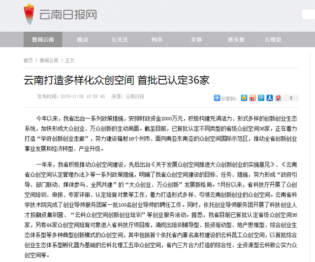 据《云南日报》讯,在云南省近日举行的“云南省众创空间授牌暨双创工作推进会”上,经省科技厅认定,云科北理工五华等36家单位成为首批省级众创空间。云南省通过搭建一批创业服务平台,真正实现创新创业资源的整合与聚集。