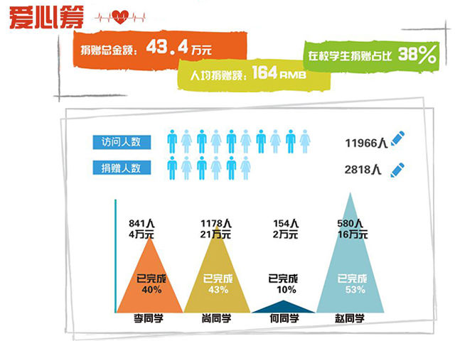 事实上,李同学事件并不是“爱心筹”第一次发起爱心捐赠,自2016年5月19日上线以来,“爱心筹”已经发起四次爱心捐赠,帮助四位校友走出困境,它借助互联网平台为需要帮助、资助的校友和学生发起捐赠服务,向突患重大疾病和遭遇突发事件的校友和学生提供最及时、有效以及最大可能的经济资助和心灵慰藉。上线至今,共计2818人慷慨解囊,向校友伸出援手,累计善款高达43.4万元。同时“爱心筹”作为公益平台不收取任何手续费,所有募集资金由学校教育基金会统一管理并最终用于筹资帮助对象,资金流向的透明公开和工作者的大爱无私受到了困难校友和社会各界的广泛认可。