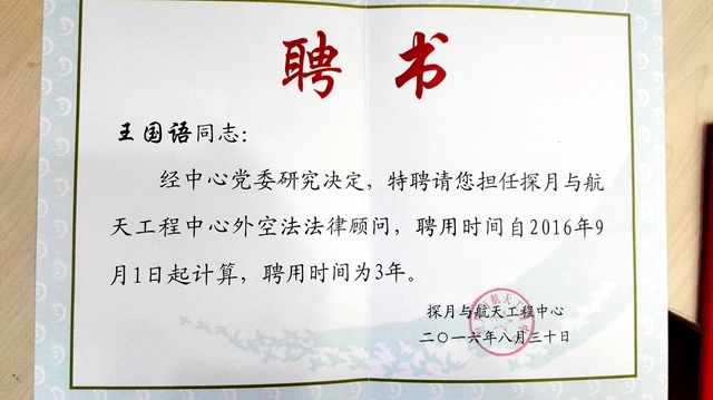 2016年9月18日,国防科工局探月航天工程中心(中心)聘请法学院王国语副教授为外空法法律顾问,王国语应邀参加了中心的聘用仪式。