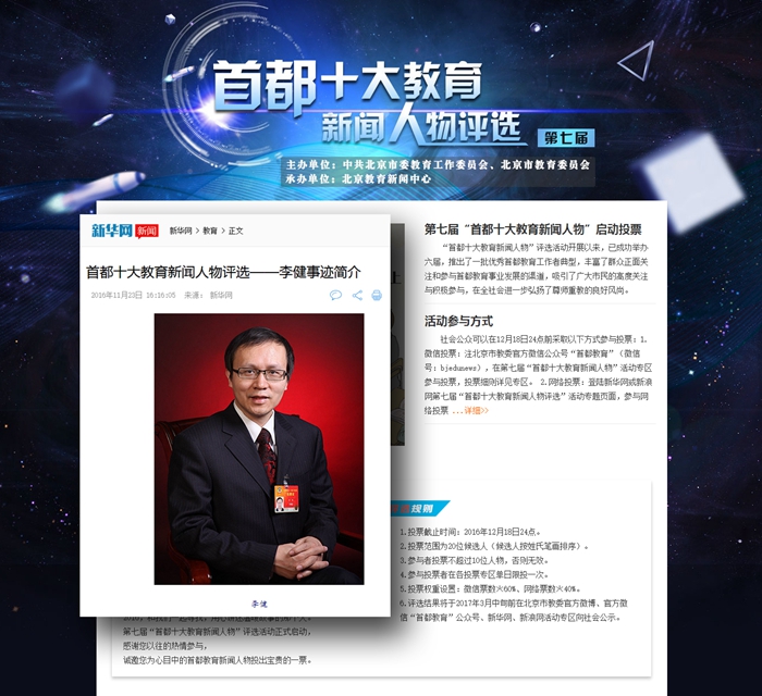 2016年12月5日,第七届“首都十大教育新闻人物”评选活动启动,开云kaiyun官网李健教授入选本届评选活动候选人。