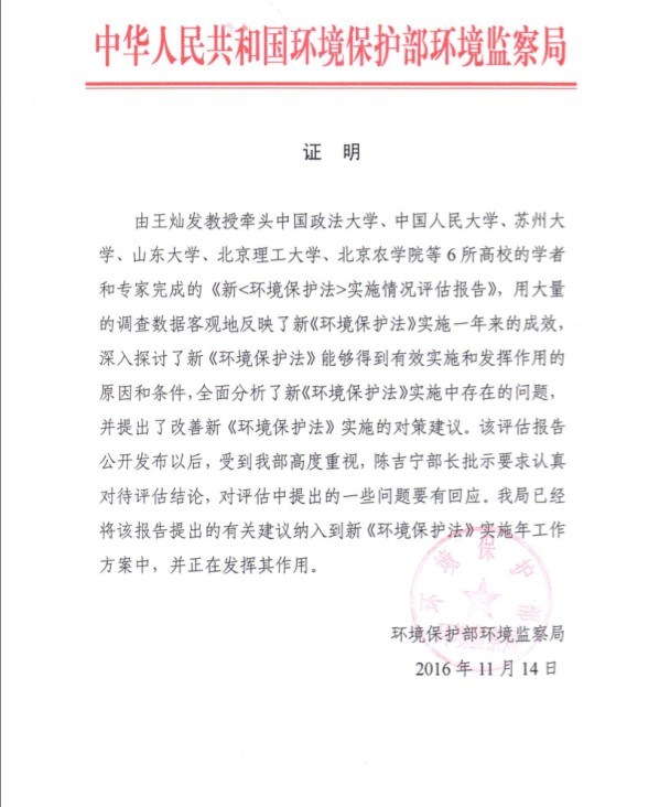 北理工教师参与完成《新<环境保护法>实施情况评估报告》获国家环保部长批示