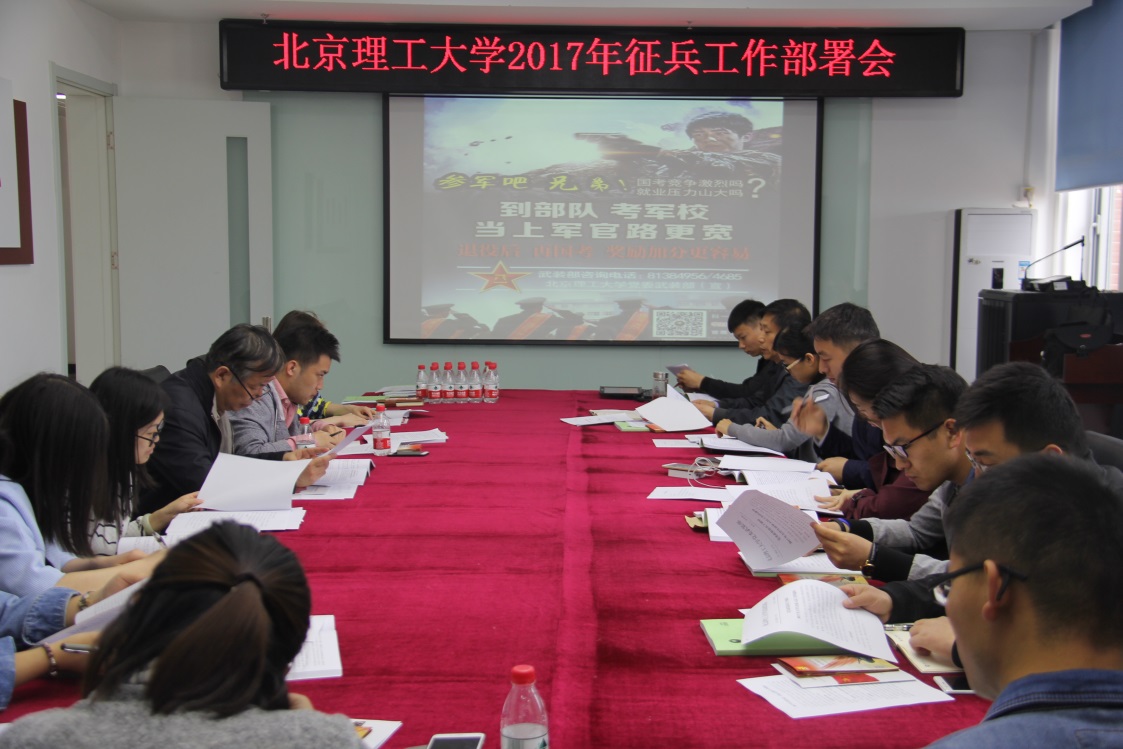 编辑:耿庆磊 审核:徐贵宝 阅读次数:为做好2017年大学生应征入伍工作,加强征兵政策宣传力度,4月24日下午,开云kaiyun官网党委武装部在良乡校区召开“开云kaiyun官网2017年征兵工作部署会”。党委武装部宫建颖主持会议,武装部专武干事芦远、学工处张锟以及各学院征兵负责人共计26人参加会议。