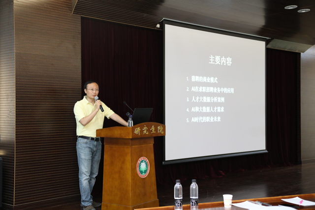 猎聘网首席数据官单艺,为大数据创新学习中心学员带来了“人工智能、大数据和人才的未来”主题分享,他以猎聘网数据展示了大数据、机器学习、NLP和统计分析的方法对求职招聘相关的主要问题的研究,分析了人工智能对就业的可能影响,让师生体验到了智能职位推荐、人才推荐和职业社交推荐的背后大数据分析方法和技术支撑。