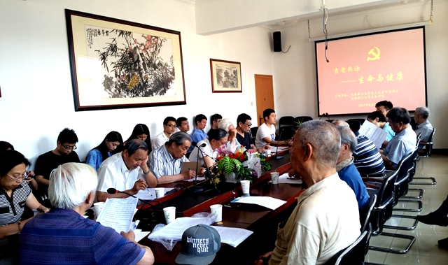 延续生命、永葆健康、防治疾病、抗击衰老是人类永恒的话题。2016年5月31日,关工委老年读书会联合生命学院学生党支部在远志楼210会议室举办了一场青老携手共话“生命与健康”的互动交流活动。离退休教职工党委书记蔡婷婷、副书记李振江、生命学院辅导员刘惠康与老年读书会的老党员、生命学院2016级硕士第一党支部全体党员近40人参加了读书交流活动。