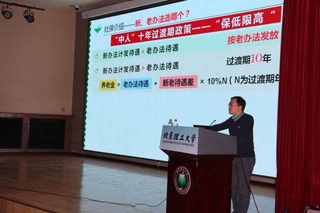 10月31日上午,“人事政策解读”系列讲座第二期“机关事业单位工作人员养老保险制度改革政策介绍”在7号楼报告厅举行。人事处处长阎艳、副处长金海波、杨静,来自学校各单位的在职教职工、离退休教师、人事干部参加了此次讲座。