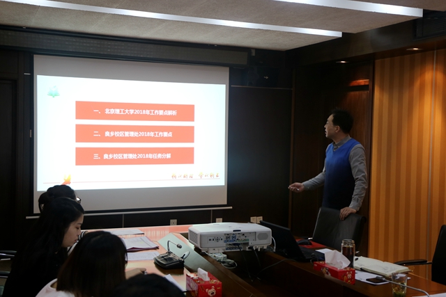 良乡校区管理处副处长张磊围绕学校工作要点和任务分解内容,对比分析了学校对良乡校区越来越关注和重视,围绕学校工作内容,详细梳理良乡校区2018年全面工作任务,重点从坚定政治意识、提高管理效能、优化校园配置、确保校园平安、积极推进外交五个方面全面提升管理效能和服务水准。要求各室、中心分别组织专项分解会议,认真研读工作报告和学校2018年工作要点及任务分解,结合良管处全年工作要点,主动承担、勇担责任,认领工作内容。要求各室、中心按照任务分解时间节点提前谋划、全面统筹,全力做好全年各项工作。