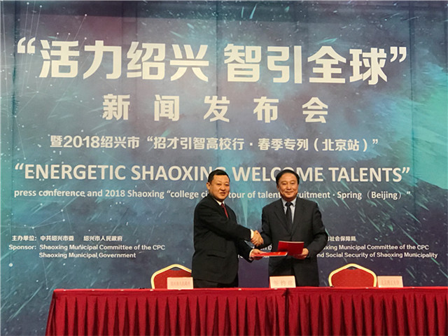 3月24日下午,“活力绍兴 智引全球”新闻发布会暨2018绍兴市“招才引智高校行•春季专列(北京站)”活动在友谊宾馆举行。会上,王晓锋代表学校同绍兴市签订了“人才智力校地合作”协议书。