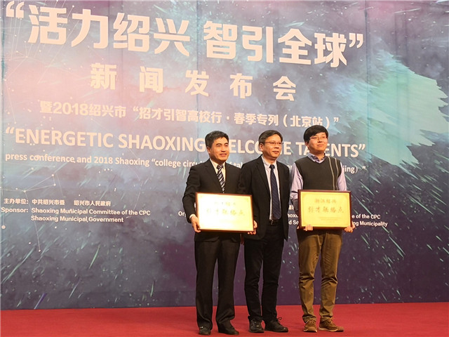 绍兴市还向学校授予了“浙江绍兴引才联络点”牌匾,招生就业工作处处长李振键接受了颁牌。