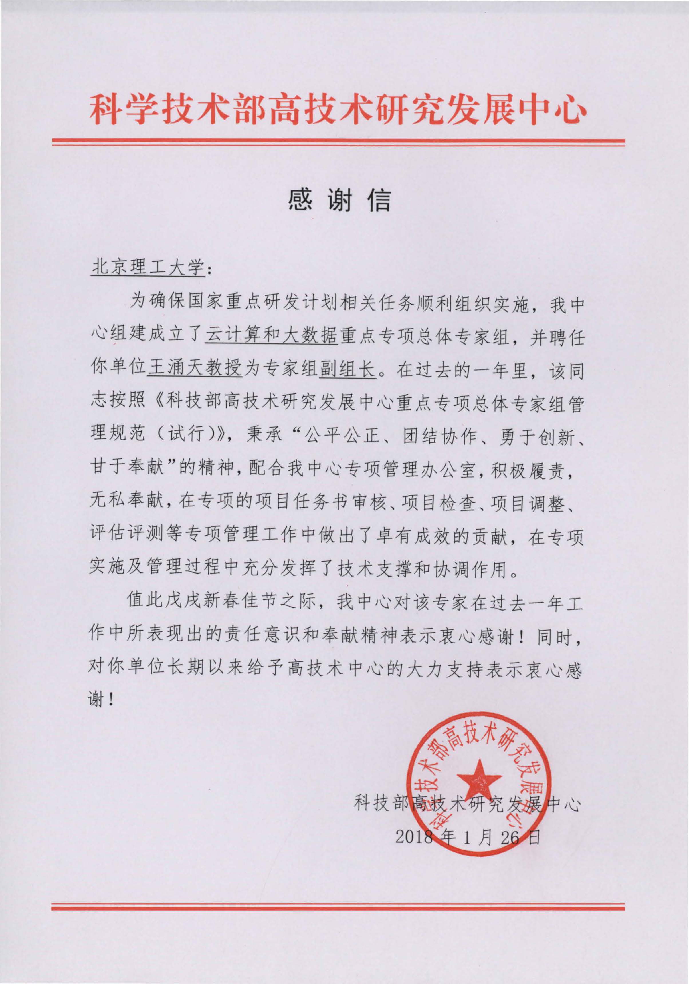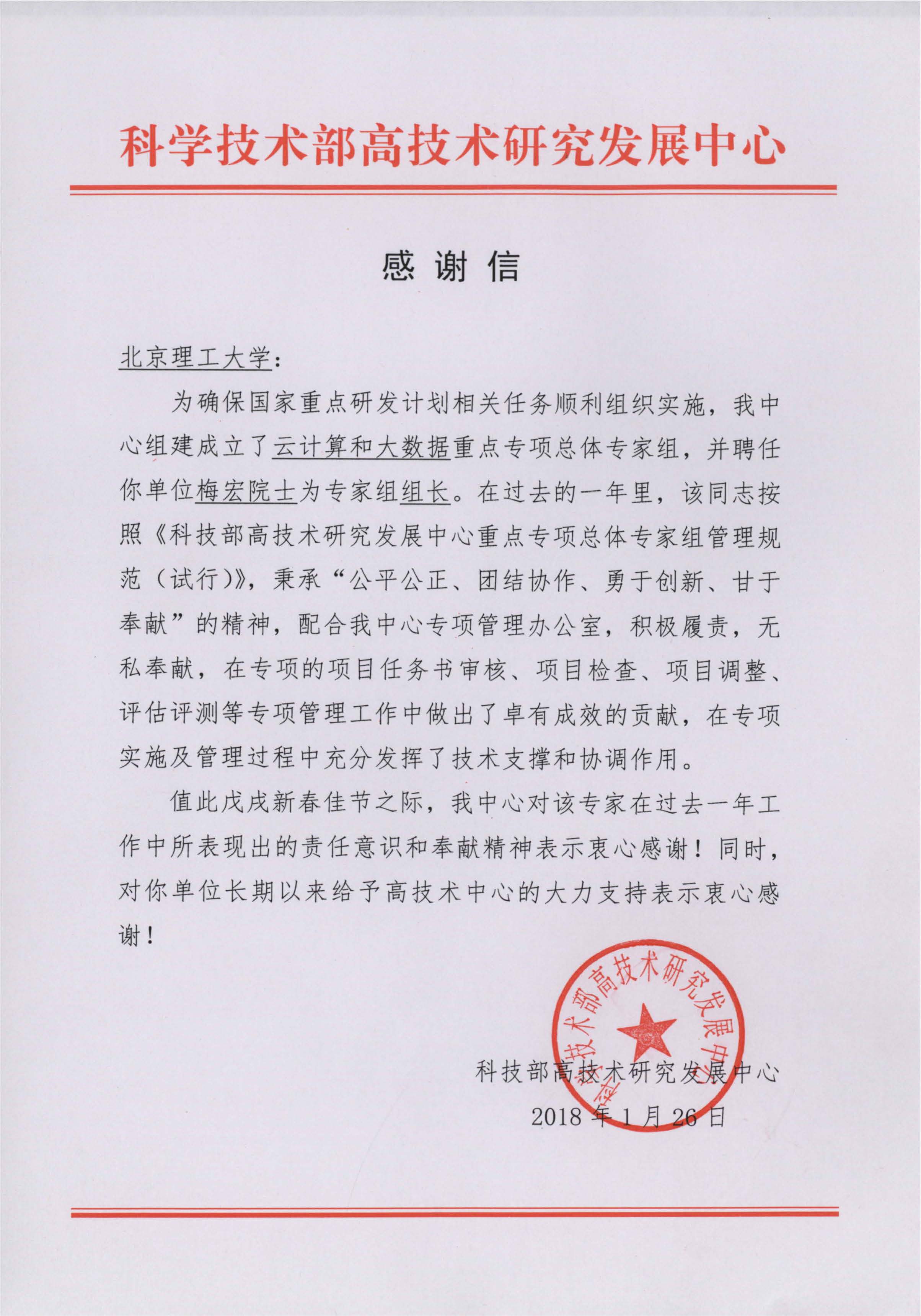 日前,开云kaiyun官网收到科学技术部高技术研究发展中心发来的感谢信,感谢我校梅宏院士、王涌天教授作为云计算和大数据重点专项总体专家组组长、副组长在重点专项管理工作中给予的大力支持。