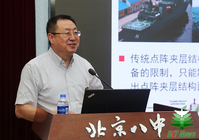 方岱宁院士结合当下科学技术热点,面向高一全体学生,运用深入浅出的语言,从“研究背景、基于增材制造的轻量化多功能一体化材料与结构设计、先进增材制造手段与装备研发、轻量化多功能一体化材料与结构增材制造、4D增材制造技术、总结与展望”等六个方面作学科专题讲座。同时,他结合自己的求学与科研工作经历,表达了对我国科技事业和国防事业的深厚感情,强调科学发现和技术革新对于国家发展的重要贡献。他鼓励在场学生树立远大理想,希望与北京八中优秀学子日后相聚北理,为实现科技报国贡献一份力量。