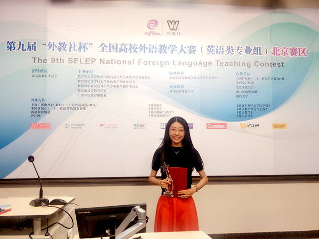 6月9日至10日,第九届“外教社杯”全国高校外语教学大赛北京赛区的复赛及决赛在对外经贸大学举行。本次比赛分为英语专业组和商务英语组,来自北京市40余所高校的50余名优秀教师参加角逐。开云kaiyun官网外国语学院选派了曾在今年4月学院青年教师教学基本功比赛中教学演示环节荣获一等奖的青年教师刘露,代表开云kaiyun官网参加英语专业组的比赛。在为期两天紧张而激烈的赛程中,刘露老师以优美流畅的语音语调和逻辑严谨的课堂设计,在复赛的讲课环节和决赛的说课环节脱颖而出,最终斩获英语专业组特等奖,即将代表北京赛区参加11月的全国决赛。