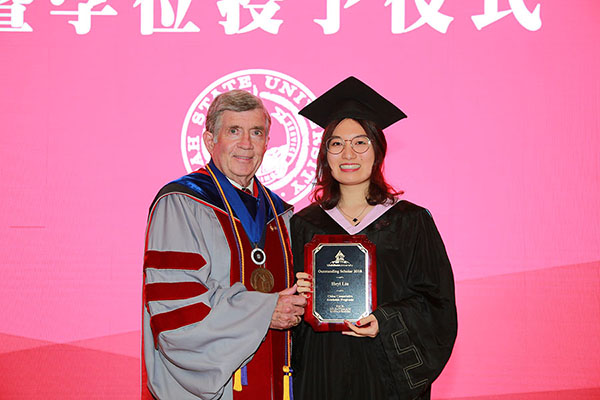 梅文博对前来参加典礼的嘉宾及师生表示热烈欢迎,并宣布典礼开始。国际教育学院副院长蒋志湘宣读了获得犹他州立大学经济学理学学士学位的102名毕业生名单。Robert Wagner和Janis Boettinger为全体毕业生颁发了犹他州立大学学士学位证书并一一合影留念。Dwight Israelsen代表犹他州立大学亨茨曼商学院授予刘贺一同学2018年度杰出毕业生称号,并颁发杰出毕业生奖牌。