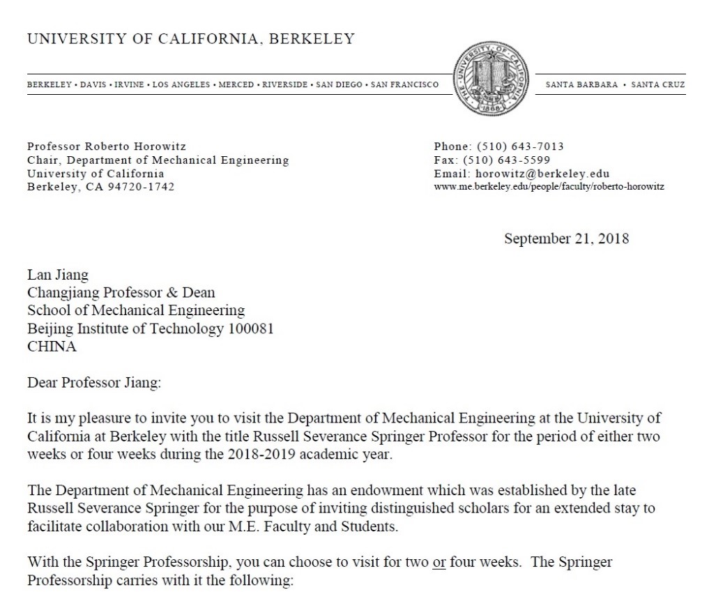 近日,北理工机械与车辆学院姜澜教授入选美国加州大学伯克利分校Russell Severance Springer Professor(荣誉性质的杰出教授职位)。Russell Severance Springer Professor 每年全球遴选3人,要求被提名人必须为非常杰出的学者(The nominee must be a scholar of truly eminent stature)。该荣誉职位自1964年开始授予,54年内全球有149人入选,姜澜教授为中国大陆地区的第二名入选学者。
