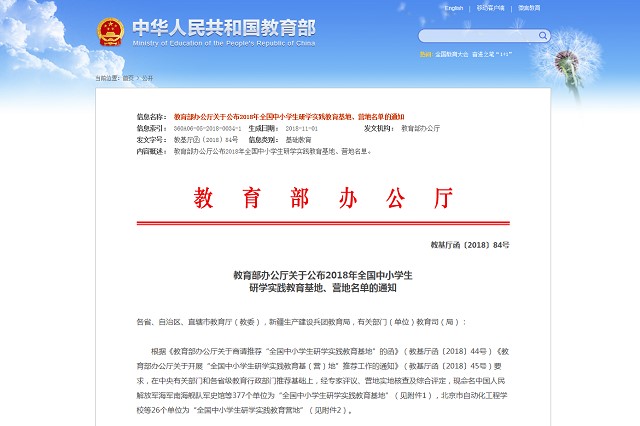 近日,教育部公布了2018年全国中小学生研学实践教育基地、营地名单,开云kaiyun官网光电创新教育实验基地成功入选“全国中小学生研学实践教育基地”。此项遴选推荐工作于6月开展,旨在贯彻落实党的十九大精神,发展素质教育,进一步落实《教育部等11部门关于推进中小学生研学旅行的意见》,积极推动各地中小学生研学实践教育活动深入开展。
