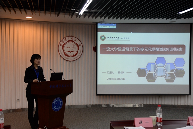 我校人力资源部副部长杨静作了题为《一流大学建设背景下的多元化薪酬激励机制探索》的专题报告,报告从学校改革背景,师资队伍情况,薪酬改革举措等方面进行了详细阐述,并就工作中遇到的难点问题,进行了分析和讲解。武汉大学人力资源部部长朱德友,同济大学人事处处长黄雨,中国科学技术大学人力资源部副部长黄方,也分别围绕高校行政管理队伍建设,加强师德师风建设,尊重学术规律,培养一流人才等作了报告。四位老师从各自高校的实际工作情况出发,进行了深入浅出的汇报,具有现实意义,获得参会人员一致好评。