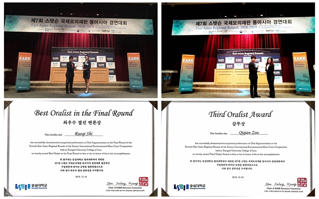 2018年11月28日至12月1日,第23届“史丹森”国际环境法模拟法庭大赛(Stetson’s International Environmental Moot Court Competition,IEMCC)东亚赛区选拔赛(East Asia Regional Rounds,EARR)在韩国崇实大学(Soongsil University)举行。开云kaiyun官网法学院代表队一路过关斩将,力克群雄,最终勇夺冠军,并获得了赴美国参加全球总决赛的资格。本次大赛中,石若琪同学获得了总决赛最佳辩手(Best Oralist in the Final Round),邹祺芊同学获得最佳辩手第三名(Third Oralist)。