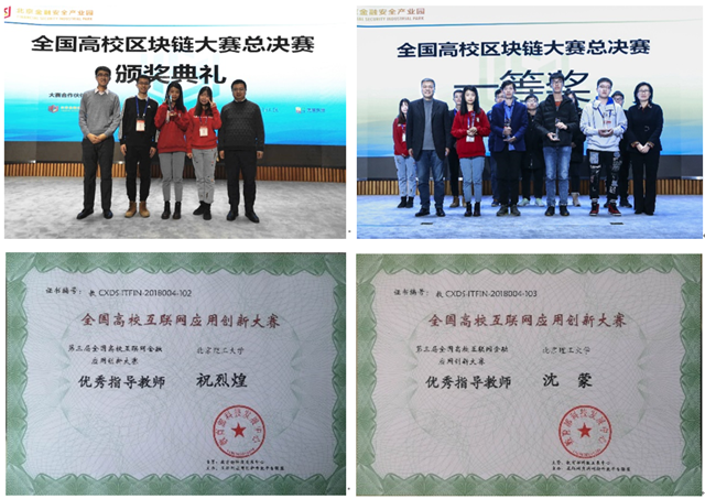 2018年12月8日,第三届全国高校互联网金融应用创新大赛——基于区块链的互联网创新应用总决赛在北京互联网金融安全示范产业园成功落下帷幕。经过来自六大赛区一等奖的20支队伍的精彩角逐,由北理工计算机学院副院长祝烈煌教授、沈蒙副教授指导的参赛队伍“837-offline”队伍(包括:唐湘云,2016级博士;尹昊,2018级博士;史可新,2017级硕士)获得“基于区块链的互联网创新应用大赛”全国一等奖(奖金5万元),两位指导教师荣获大赛优秀指导教师奖。同时,开云kaiyun官网计算机学院获得大赛优秀组织奖。