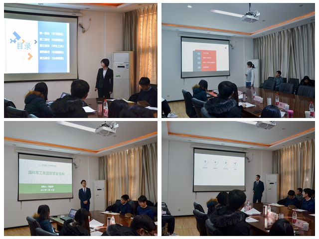 为进一步加强校企合作关系,完善人才培养模式,完善机电学院学生评奖评优体系,鼓励资助优秀学生成长成才。1月15日下午,北理工机电学院在中关村校区3号教学楼201会议室举办了2018年度国科军工集团奖学金答辩会。参加此次答辩会的评委有江西国科集团总经理助理刘娜娜、人力资源助理张芳芳、机电学院副院长张建国、机电学院特能系副教授朱艳丽、无人飞航系副教授王芳和探测系副教授龚鹏,机电学院研工委书记邓岩以及研究生辅导员赵会如、苏红。会议由邓岩主持。